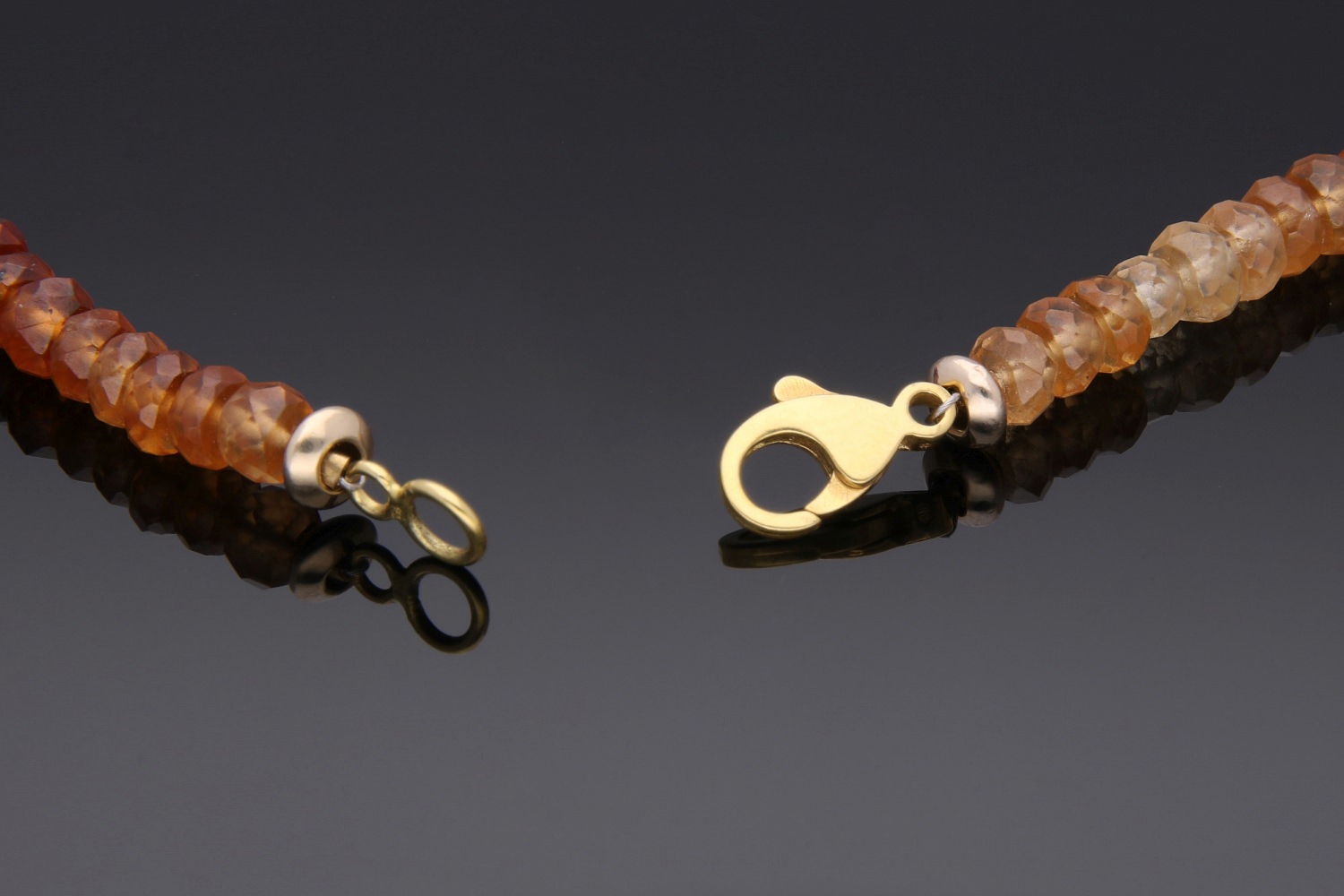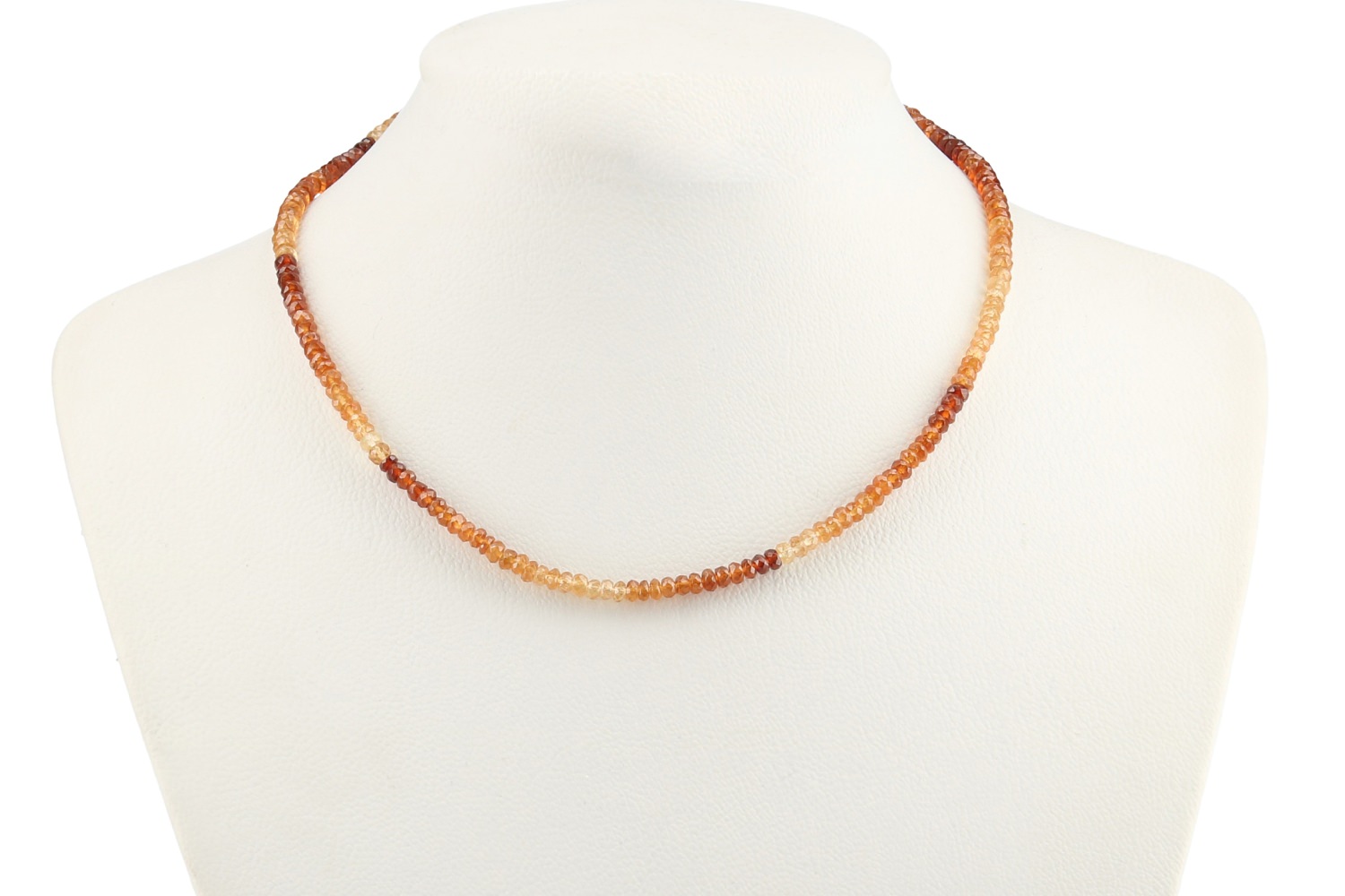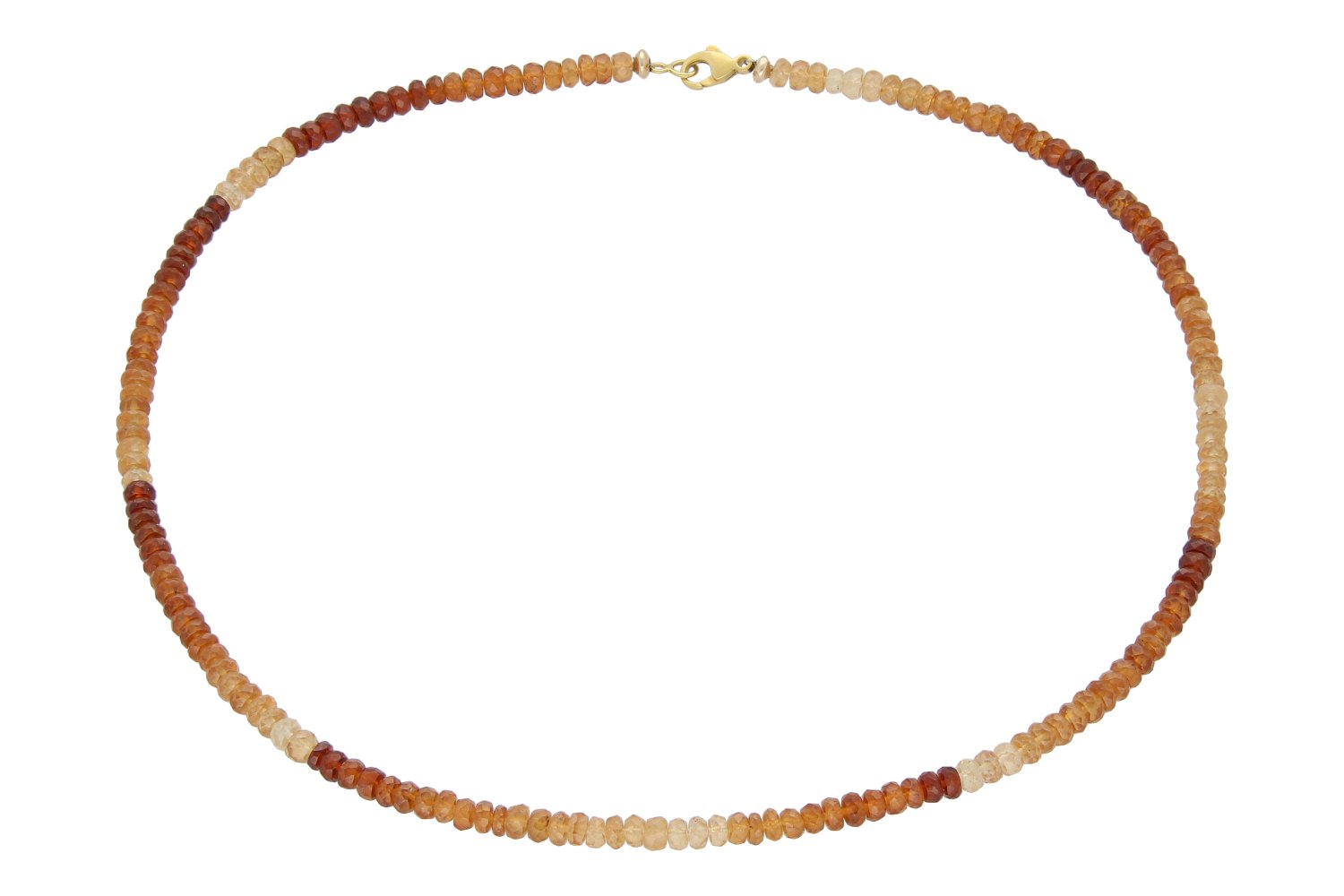 Kette mit facettierten 4mm-Buttons aus Hessonit im Farbverlauf. Das geschmackvolle Collier ist auf hochwertigen Edelstahl gefädelt und besitzt einen 11mm-Karabiner aus 14-karätigem Gelbgold (585/1000). Dieses feine Schmuckstück aus unserer Werkstatt zeigt die orangen bis braunen Farbtöne dieser Granat-Varietät.