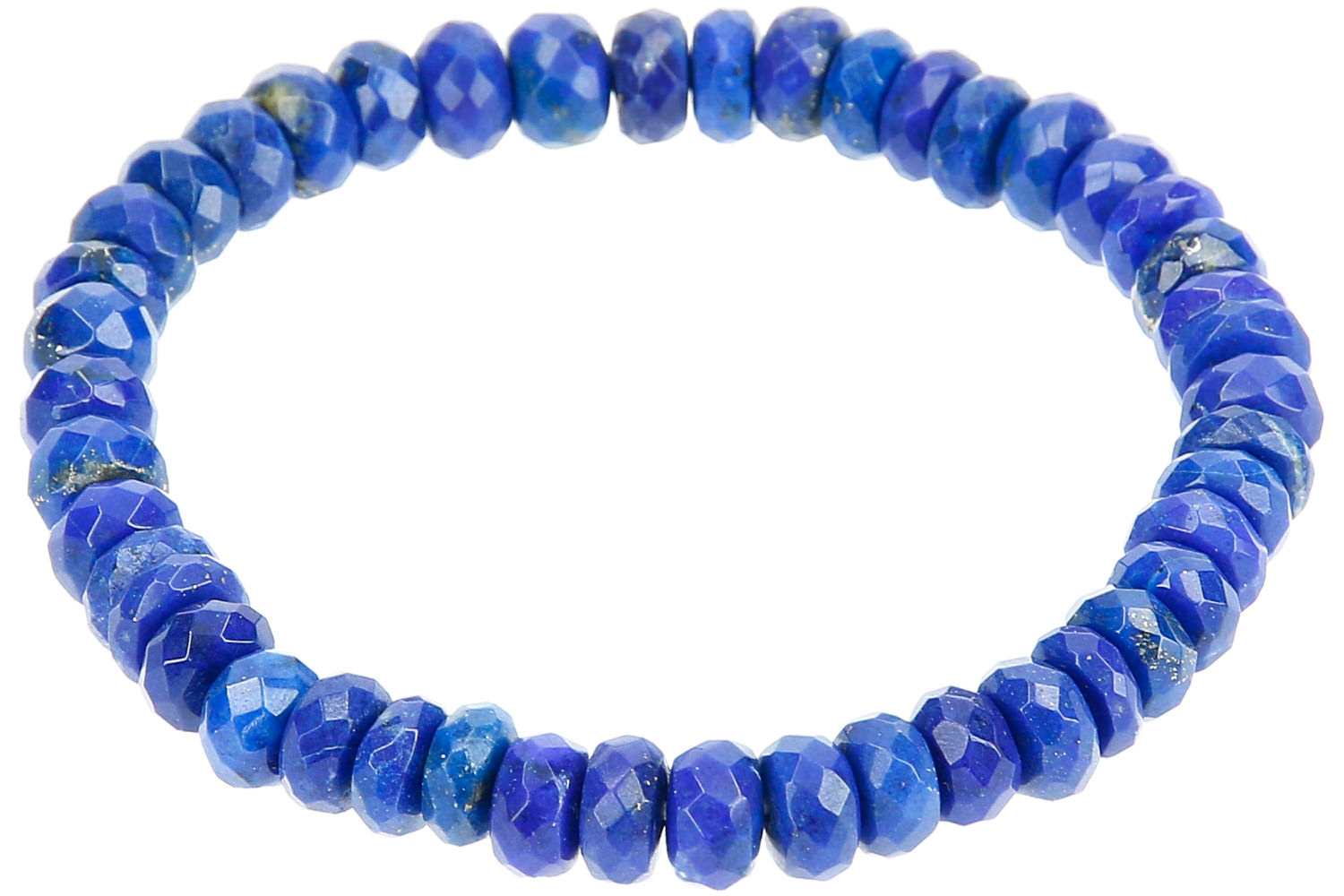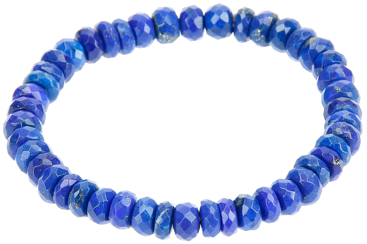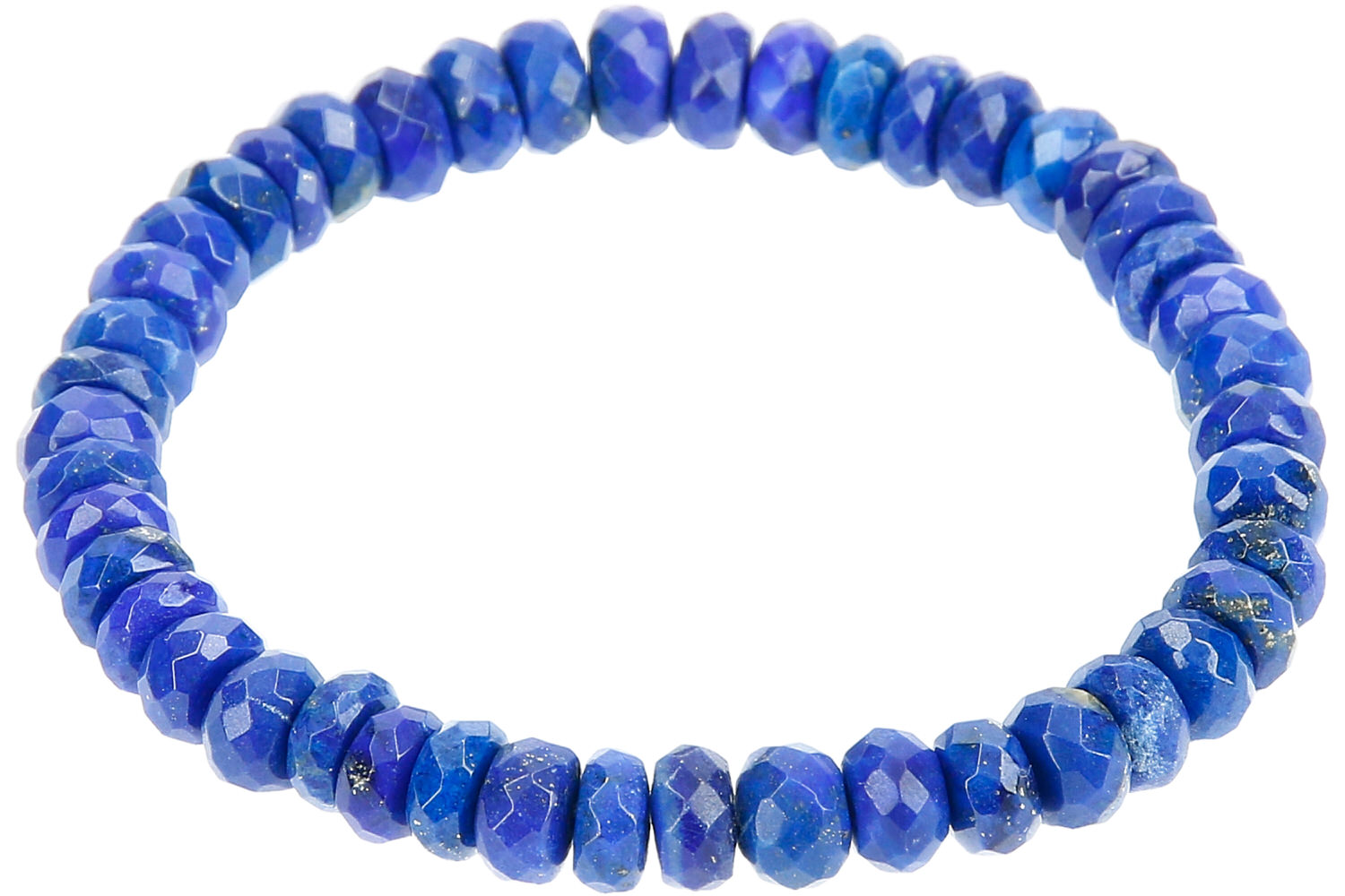 Facettiertes Button-Armband aus königsblauem Lapislazuli mit goldenen Pyriteinlagerungen. Dieses hochwertige Schmuckstück ist auf ein stabiles Elastkband gezogen. Dieser Lapis aus Afghanistan ist von sehr guter Qualität und die Facetten lassen die Edelsteine wunderbar funkeln. Mit diesem Armband ist Frau immer gut angezogen.