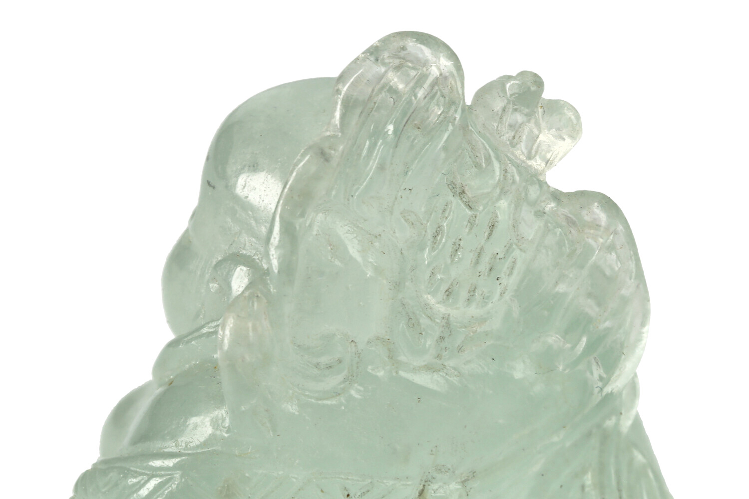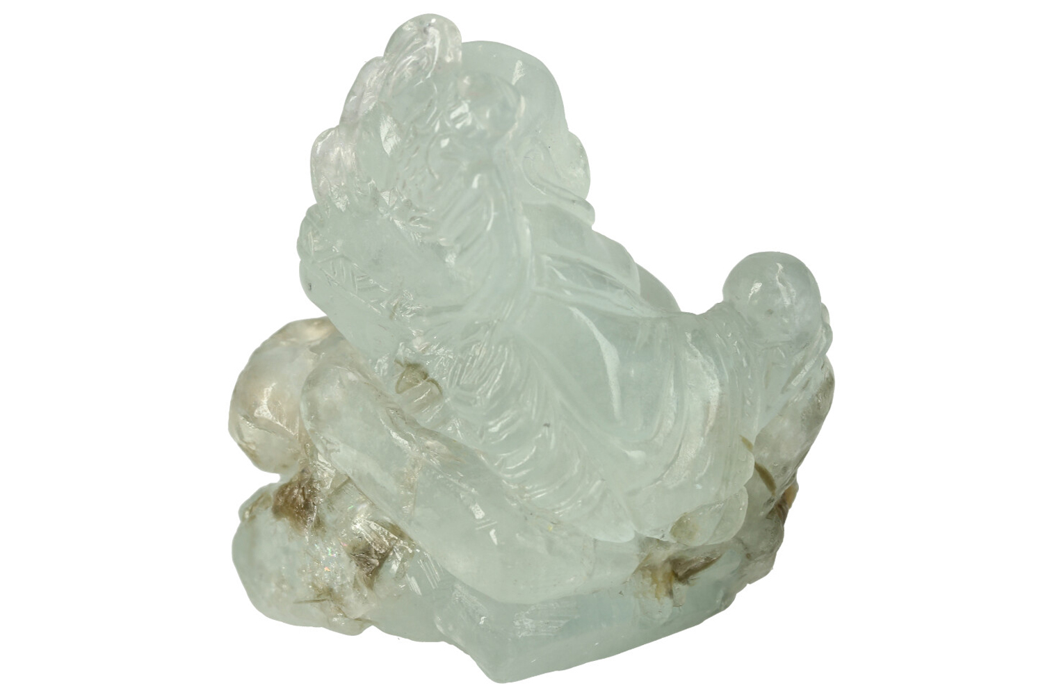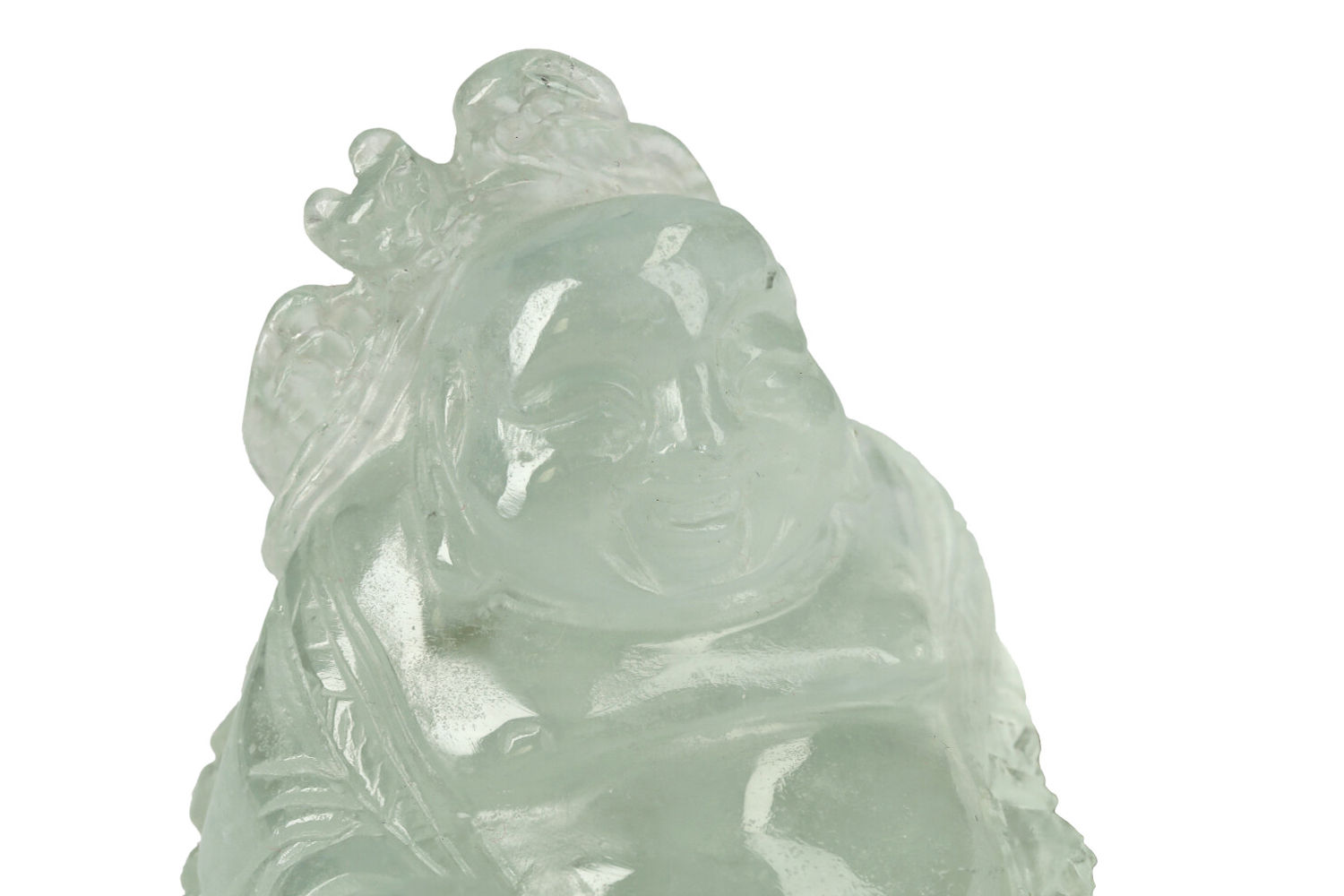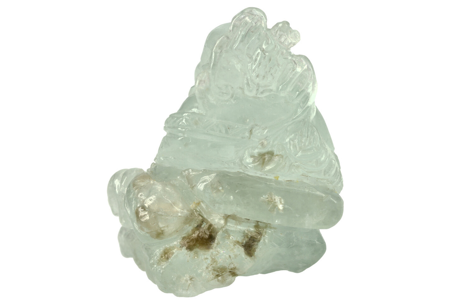 Gravur des lachenden Buddhas (Happy Buddha) aus transparentem Aquamarin. Aquamarin Gravuren sind sehr selten und dieses kleine Meisterwerk ist hervorragend. Der Happy Buddha kommt aus dem chinesischen (Budai) und wird im japanischen Buddhismus (Hotei) genannt. Seine üppige Figur symbolisiert Reichtum und Lebenslust. Diese originelle Gravur ist sehr fein gearbeitet mit den charakteristischen Details wie langen Ohrläppchen, dem feisten Grinsen und der Glückskugel in seiner Rechten. In entspannter Körperhaltung sitzt er an sein Bündel gelehnt. Hinter seinem rechten Arm ist ein Stapel Feng Shui Coins, auch Glücksmünzen genannt, zu sehen. Auf den Schultern des Buddha sitzt eine Fledermaus, welche in China ein Symbol des Glücks und eines langen Lebens ist. Das aus einem einem großen hellblauen Aquamarin-Kristall geschnitzte Unikat zeigt vorne an seinem rechten Fuß Muskavit-Einlagerungen. Muskovit ist ein Mineral, welches man oft mit pakistanischen Aquamarinen vergesellschaftet findet.