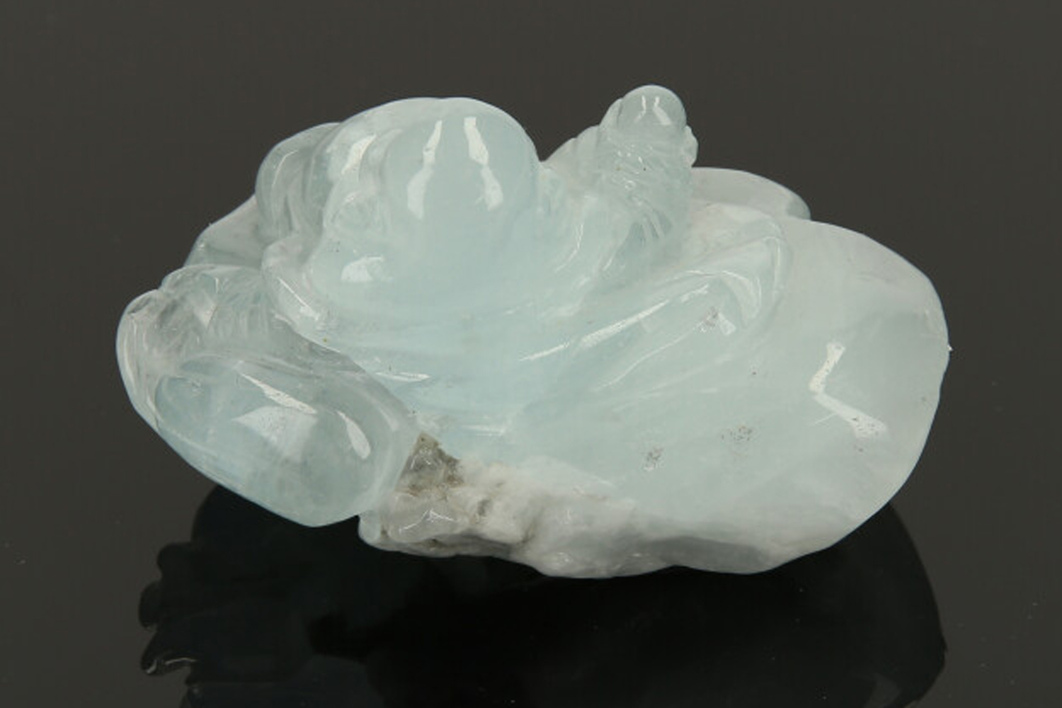 Gravur des lachenden Buddhas (Happy Buddha) aus hellblauem Aquamarin. Aquamarin Gravuren sind sehr selten und dieses kleine Meisterwerk ist beeindruckend gearbeitet. Der Happy Buddha kommt aus dem chinesischen (Budai) und wird im japanischen Buddhismus (Hotei) genannt. Seine üppige Figur symbolisiert Reichtum und Lebenslust. Diese Gravur ist ein besonders interessantes Exemplar: die Unterseite zeigt den Rohstein und schräg durch das Objekt zieht sich ein Spannungsriss (keine Sprung oder Beschädigung) So präsentiert sich d iese Edelstein schnitzerei in zweierlei Blautönen! Der sehr fein gearbeitete Buddha ist mit den charakteristischen Details wie langen Ohrläppchen, dem feisten Grinsen und der entspannten Körperhaltung ausgestattet. Auch die typschen Attribute wie die Glückskugel und sein Bündel, an welches er sich angelehnt hat, fehlen nicht. Auf der Rückseite der Gravur zeigt sich  eine typische, graubraune Muskovit Einlagerung.